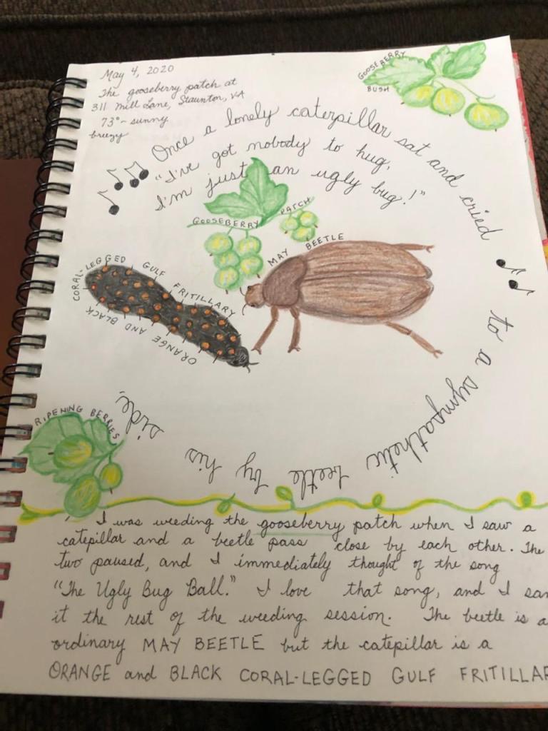 I was weeding when I found a May beetle and a Black-and-Orange Coral Legged Fritillary heading toward each other. Of course, The Ugly Bug Ball, my favorite song from a Haley Mills movie, Summer Magic came to mind.
