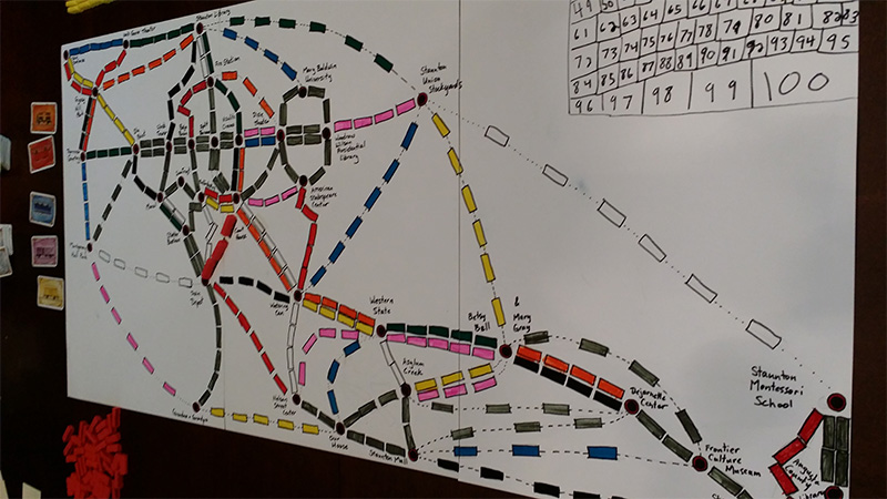 The game Ticket to Ride has so many cool variations. There’s the original US map, Europe, Africa, UK … but there isn’t an edition showing our hometown. The boys worked to develop a new Ticket To Ride: Staunton edition.