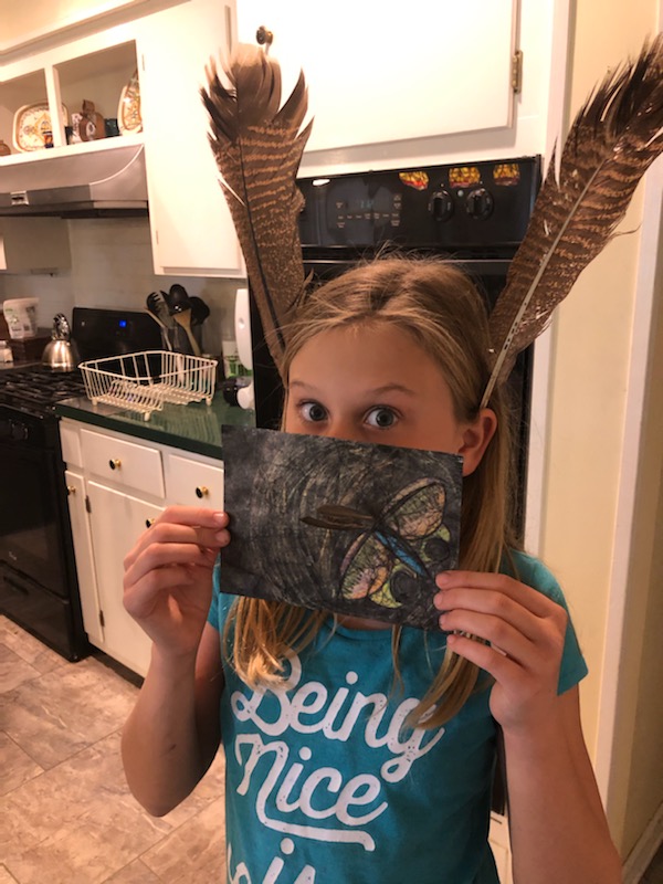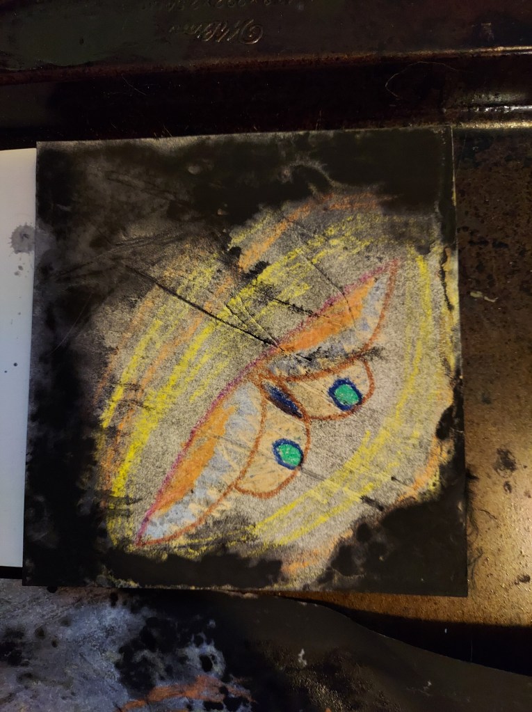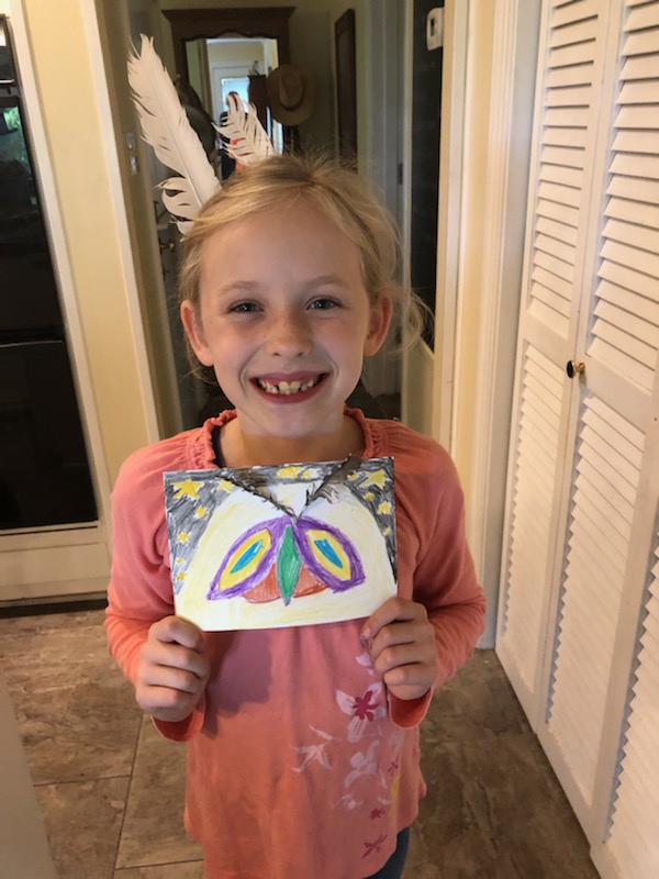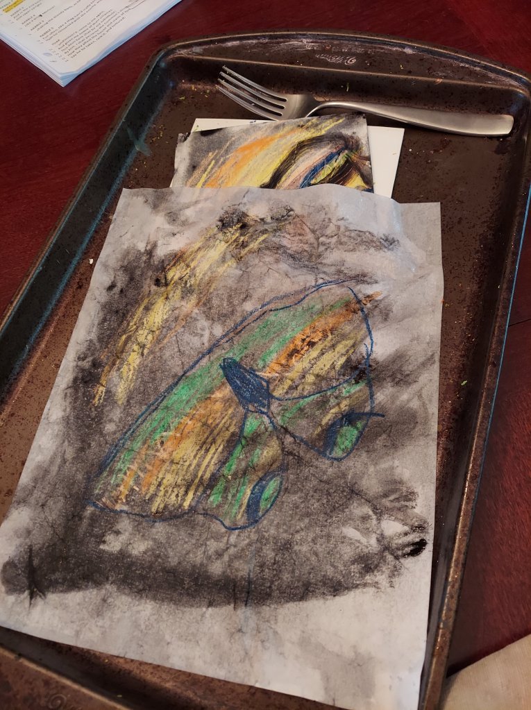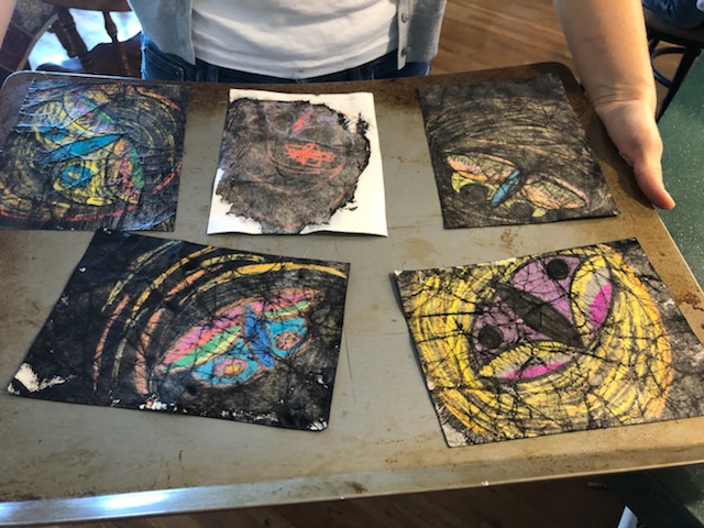 In honor of our upcoming Moth Ball, our subject was the Witch Moth! Ruthie showed us how to draw the moth with light-colored crayons, then distress the surface and paint with black acrylic to fill in the cracks.