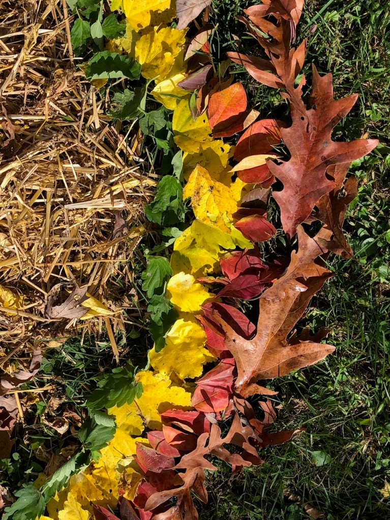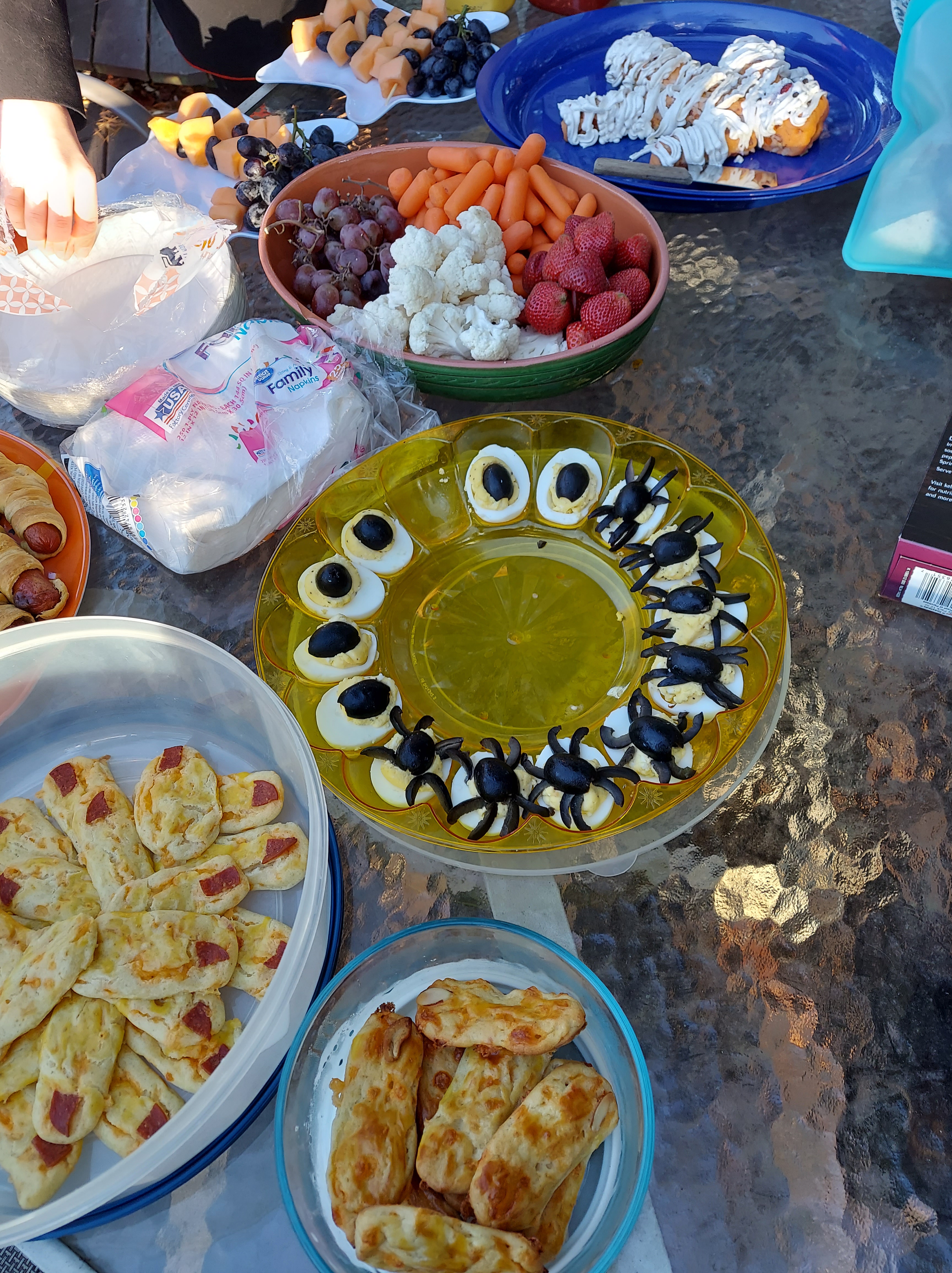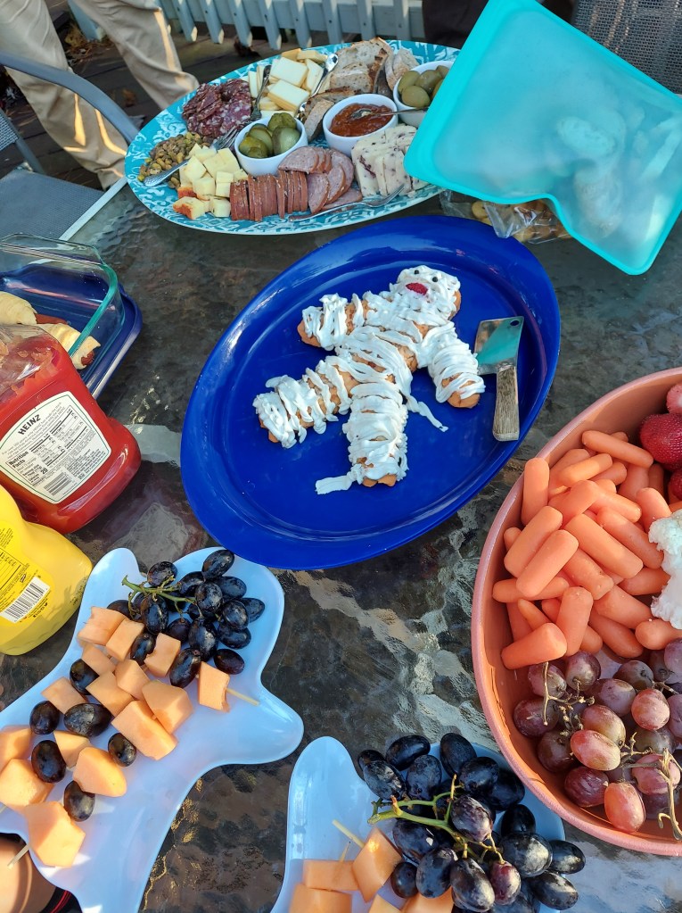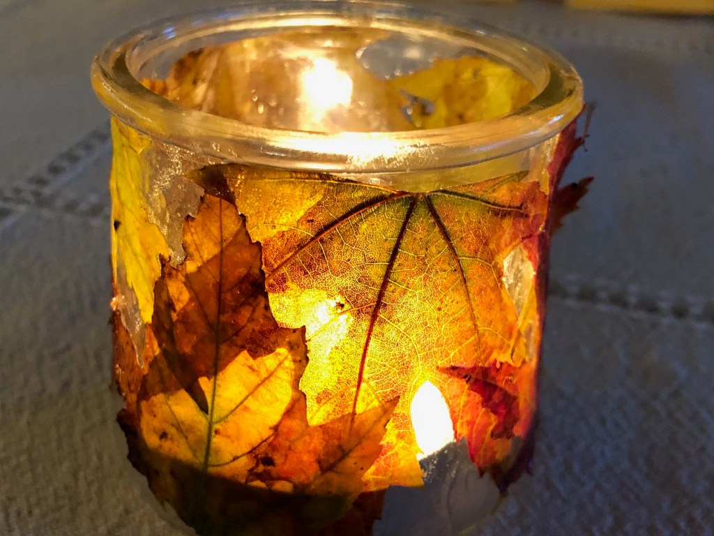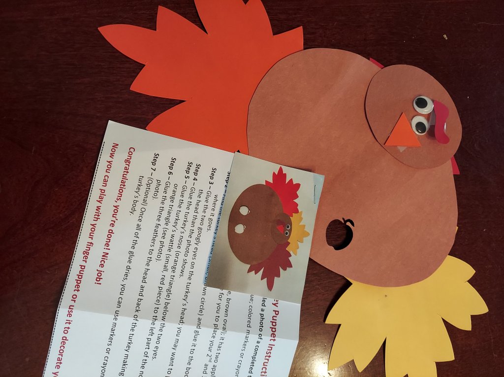 Thomas and Deena made a spider decoration for the front of our house out of garbage bags, a hula hoop, duct tape, spray paint, and rope. Shadow is supervising.Halloween food by Kathy and Deena. Cheese log mummy. Deviled egg and olive spiders. Dough and pepperoni witch’s fingers.Ecotherapy leaf art by Kathy and Daphne. Leaf tea lights by Owen, Thomas, and Kathy.Eyes of God by Owen, Thomas, and Deena. Our libraries provide craft kits when you check out books. They provided sticks, yarn, and instruction sheets for this project.Owen’s “derpy turkey,” also from a library craft kit.