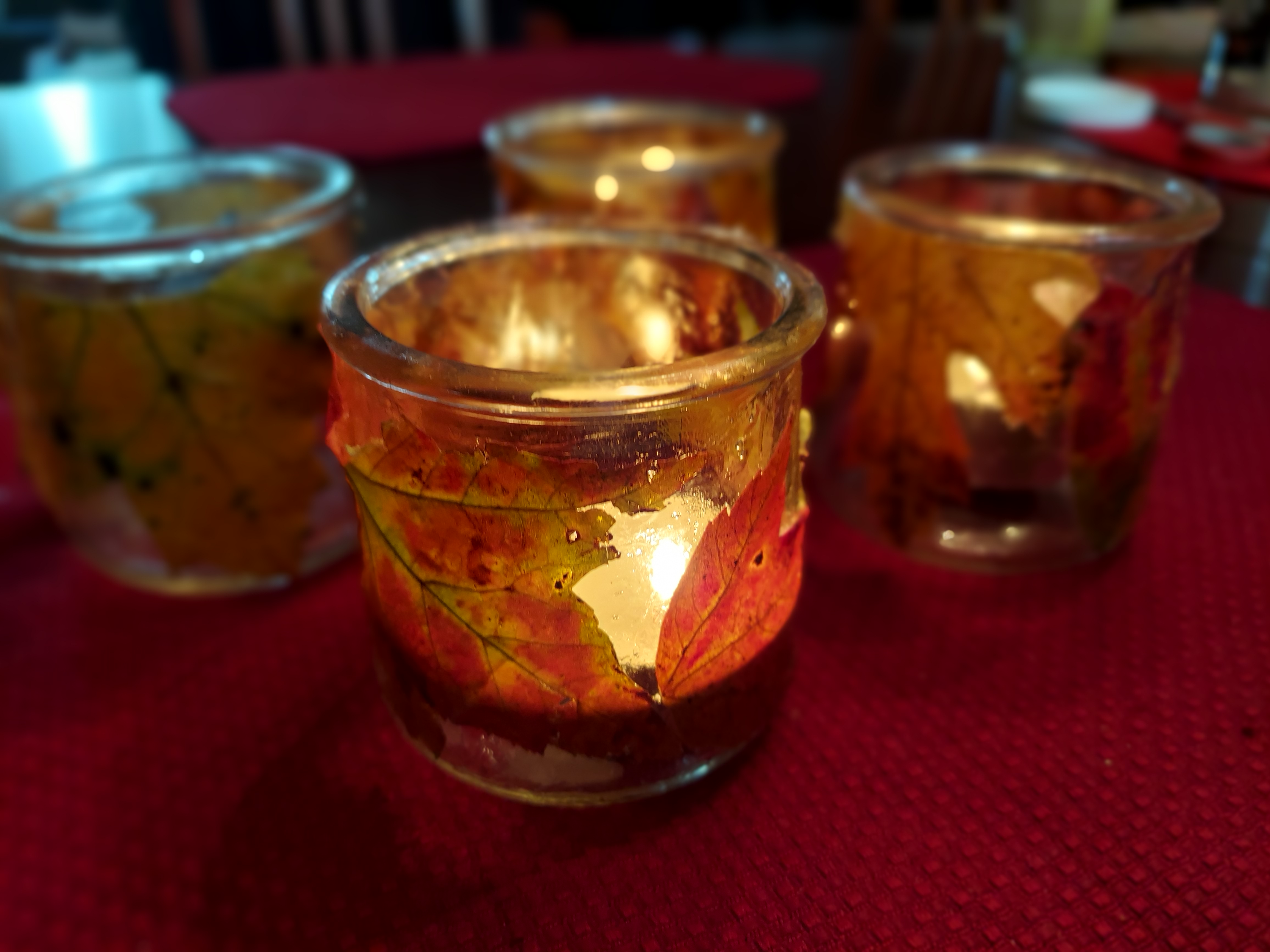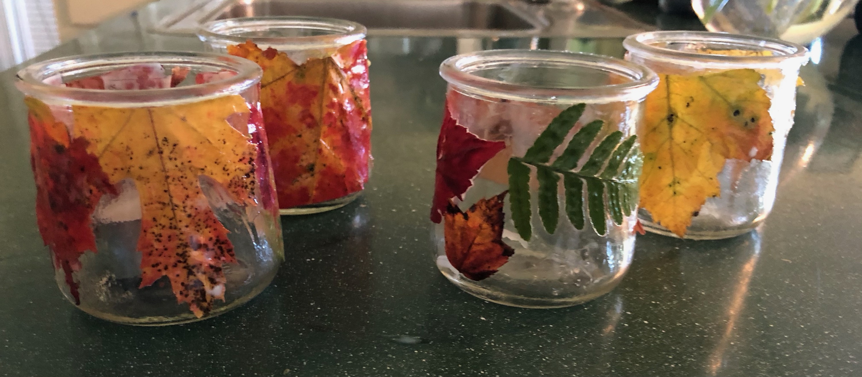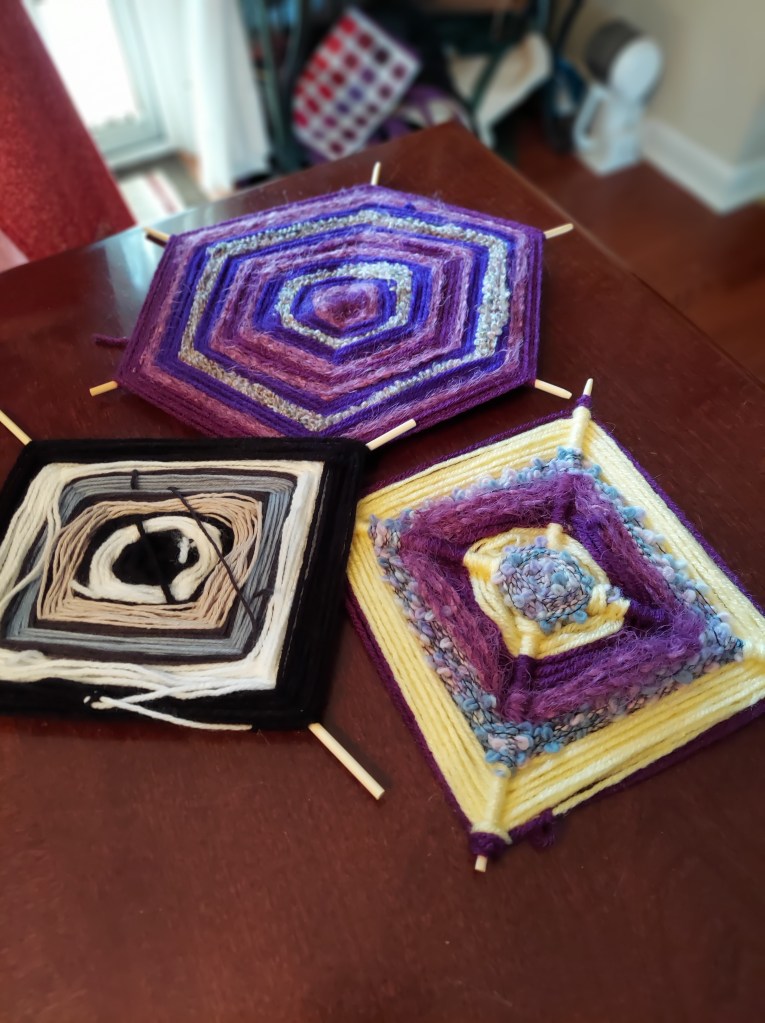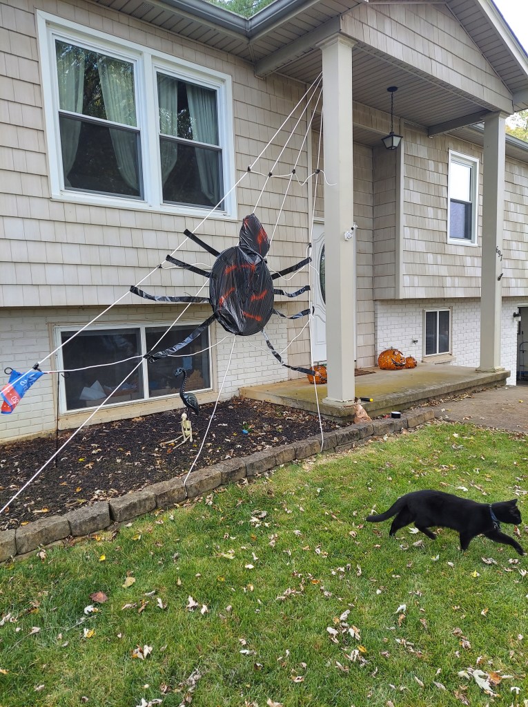 Thomas and Deena made a spider decoration for the front of our house out of garbage bags, a hula hoop, duct tape, spray paint, and rope. Shadow is supervising.Halloween food by Kathy and Deena. Cheese log mummy. Deviled egg and olive spiders. Dough and pepperoni witch’s fingers.Ecotherapy leaf art by Kathy and Daphne. Leaf tea lights by Owen, Thomas, and Kathy.Eyes of God by Owen, Thomas, and Deena. Our libraries provide craft kits when you check out books. They provided sticks, yarn, and instruction sheets for this project.Owen’s “derpy turkey,” also from a library craft kit.